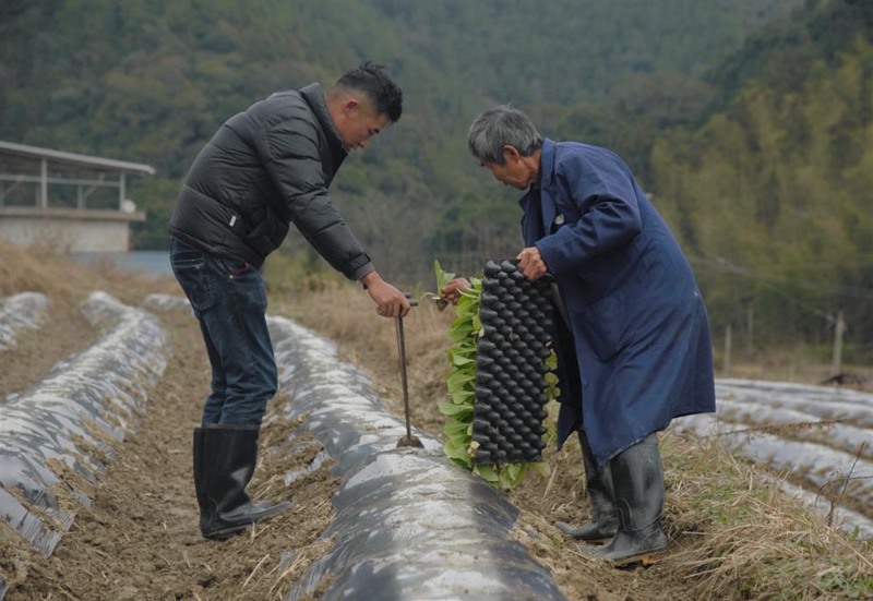 罗小平(左)和父亲一起抢栽烟苗。新华社记者李昊泽 摄