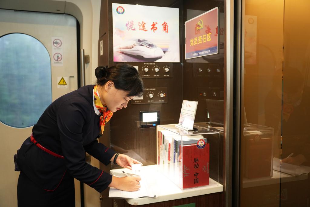 列车乘务员在做图书借阅登记。(魏星亮 摄)