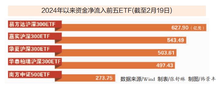 2024年以来,最“吸金”的三只基金资金净流入均超过500亿元,分别是易方达沪深300ETF、嘉实沪深300ETF、华夏沪深300ETF,分别净流入627.90亿元、543.49亿元、503.61亿元。此外,华泰柏瑞沪深300ETF净流入497.43亿元,南方中证500ETF、华夏上证50ETF、易方达创业板ETF净流入均超过200亿元。