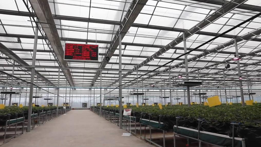 智慧农场玻璃温室现共种植三个品种、八万株草莓,均为自主繁育的草莓苗。科学种植促进了丰产,两座玻璃温室均可一年四季连续生产。