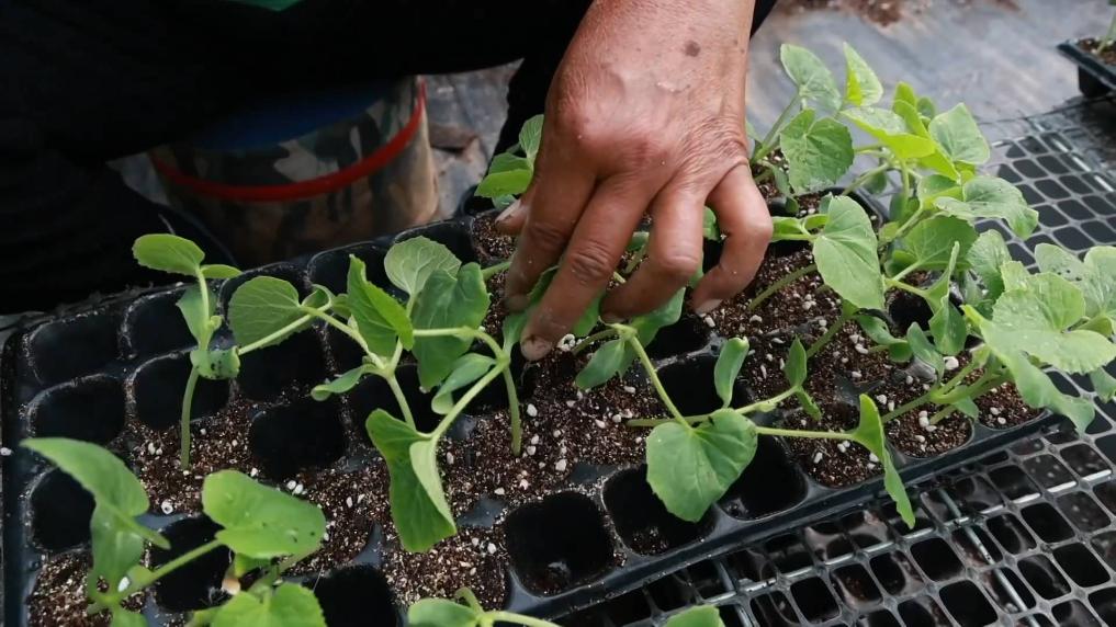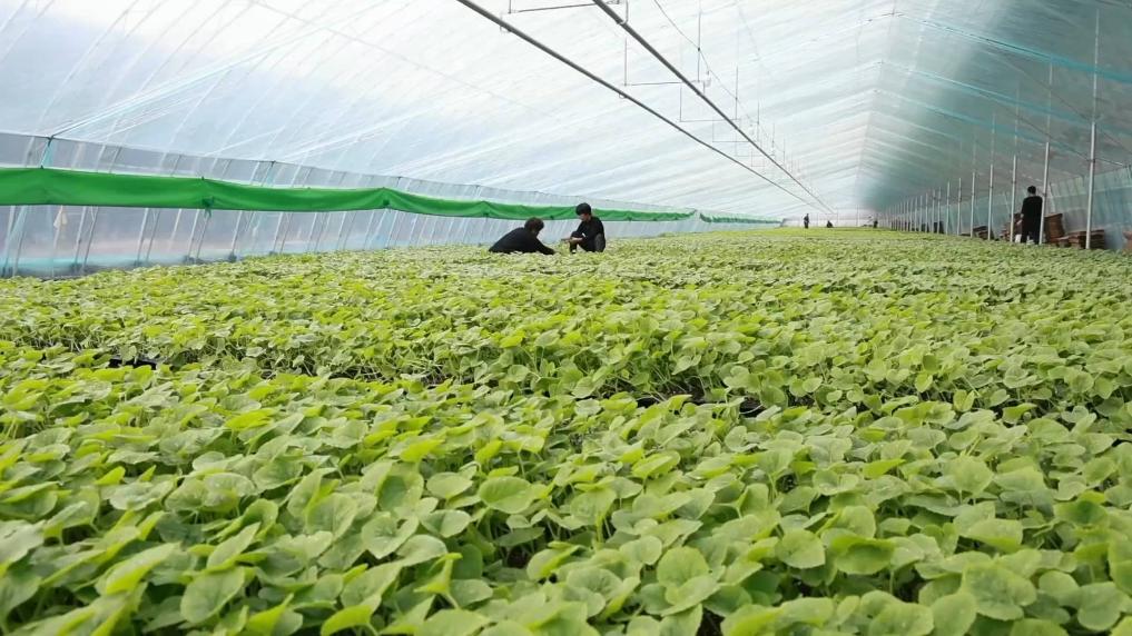 在河北衡水饶阳县的众瑞种苗基地,基地的工作人员在县农技专家的指导下,用自动喷淋系统给种苗浇水浇肥。众瑞种苗基地的这些智慧温室都是在去年重建的。