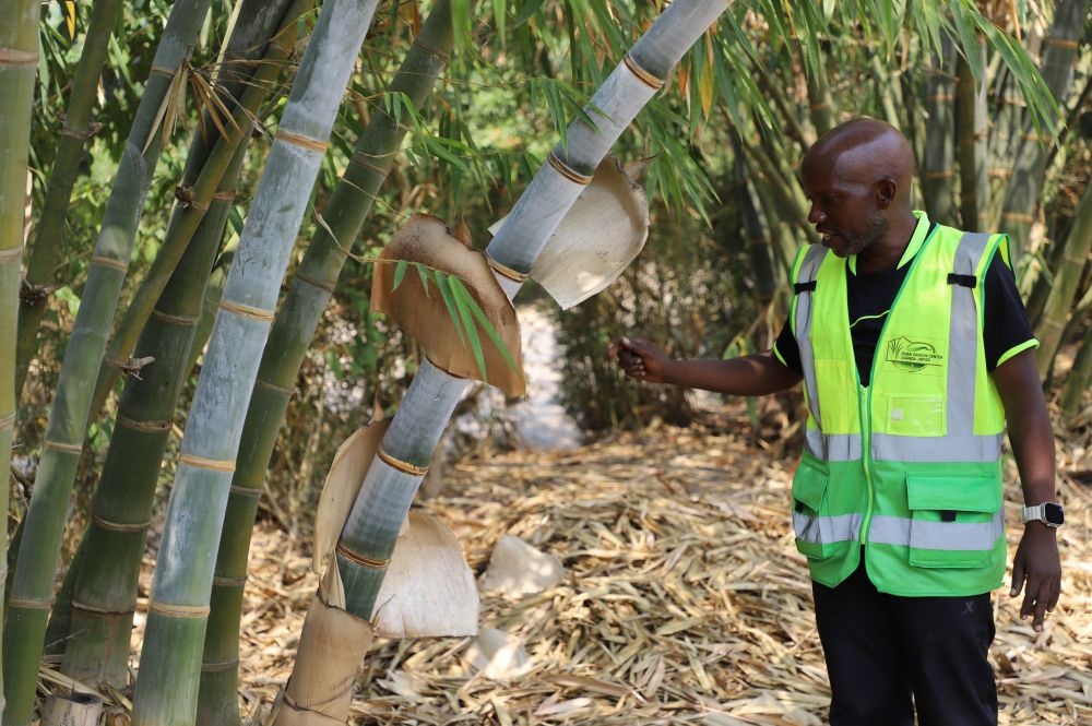 8月5日,乌干达西部姆巴拉拉市,阿比·史蒂夫·图西梅在竹子种植园查看竹子长势。新华社发(罗纳德·塞坎迪 摄)
