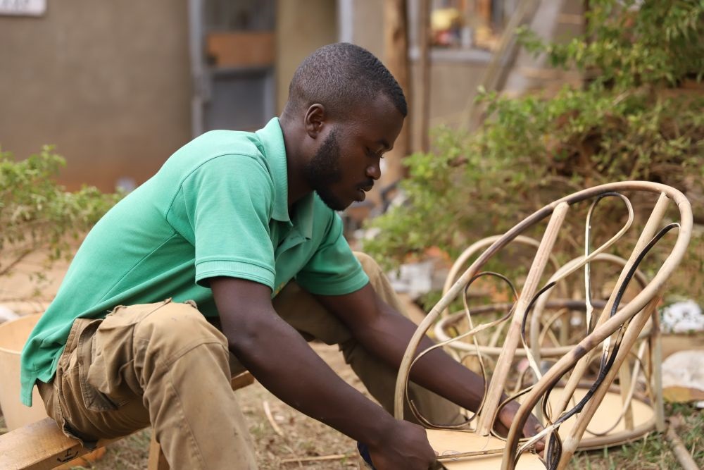 8月10日,卢旺达首都基加利,让·尼永库鲁正在工坊里制作竹艺椅子。新华社记者 吉莉 摄