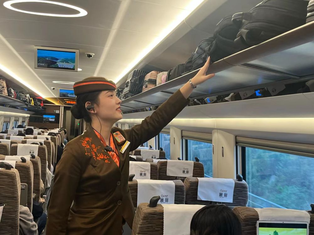 中国铁路武汉局集团有限公司武汉客运段列车员在整理旅客行李。(中国铁路武汉局集团有限公司供图)