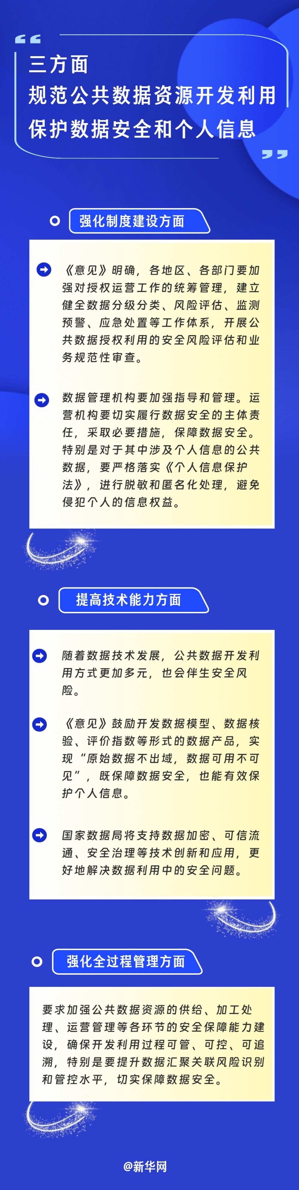 《意见》强调了要在维护国家数据安全、保护个人信息和商业秘密的前提下,推动有序开发利用。特别是重申了应当保密的公共数据不予开放,严格管控未依法依规公开的原始公共数据直接进入市场,严禁运营机构未经授权超范围使用数据。具体来说,《意见》从制度建设、能力建设和过程管理三个方面提出了要求。