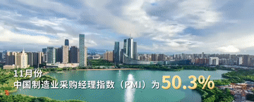 11月份,中国制造业采购经理指数(PMI)为50.3%,连续2个月在扩张区间运行。