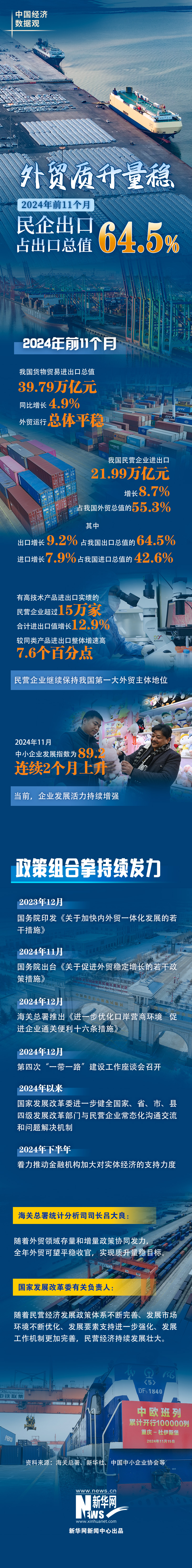 中国经济数据观丨外贸质升量稳 前11个月民企出口占出口总值64.5%