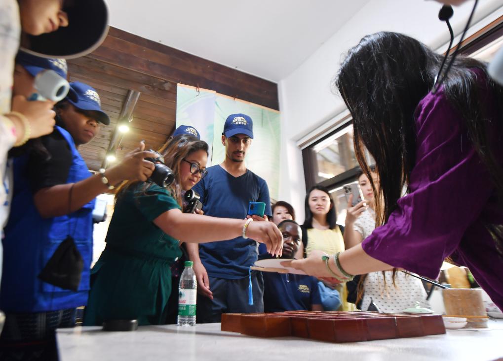 2024年9月3日,在湖南常德,外国游客体验非遗麻质画制作。新华社记者 赵众志 摄