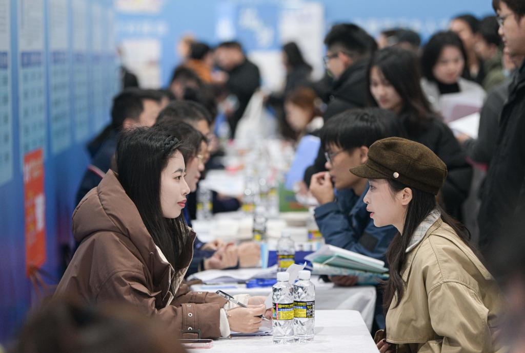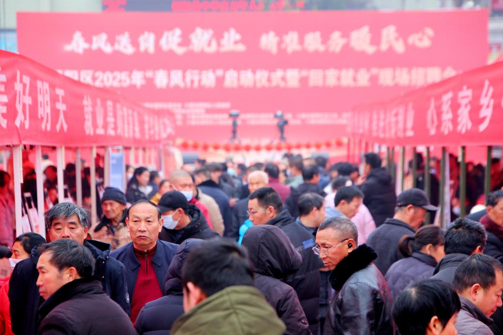 2025年1月22日,求职者在湖北省十堰市郧阳区“春风行动”招聘会上查看招聘信息。新华社发(曹忠宏摄)