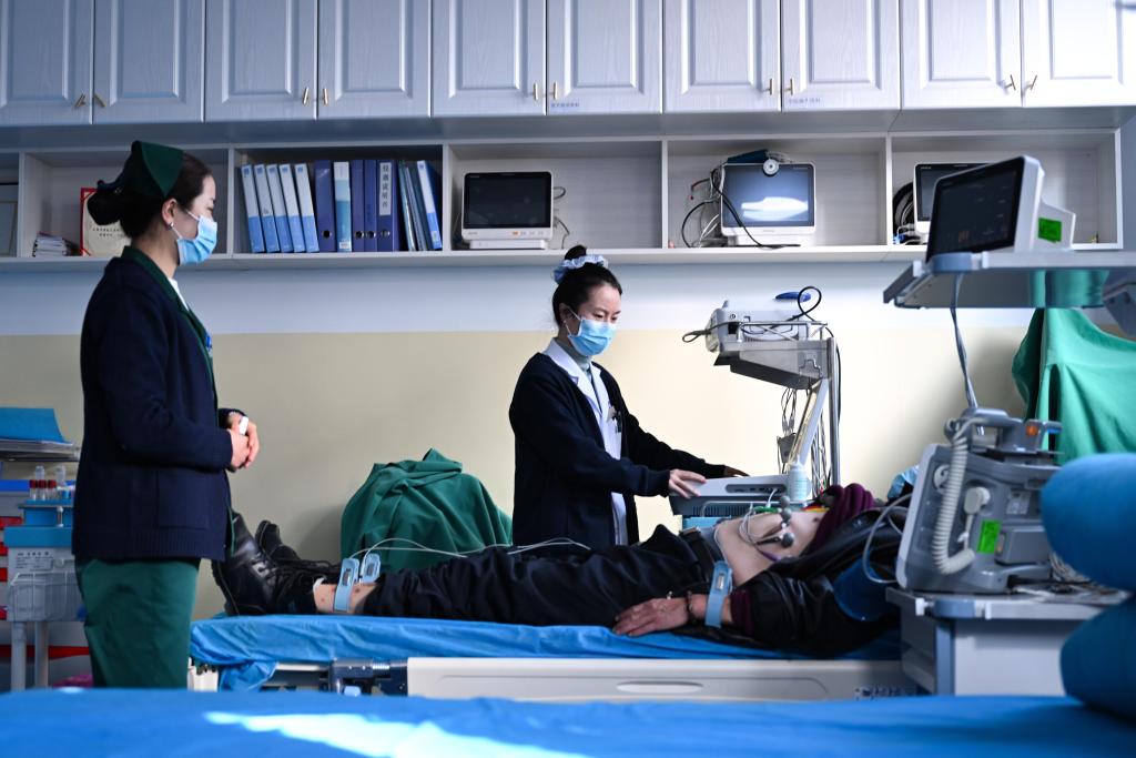 2024年12月17日,在青海省海南藏族自治州共和县中医院,医生高俊萍(右)在给患者做心电图。新华社记者张龙摄