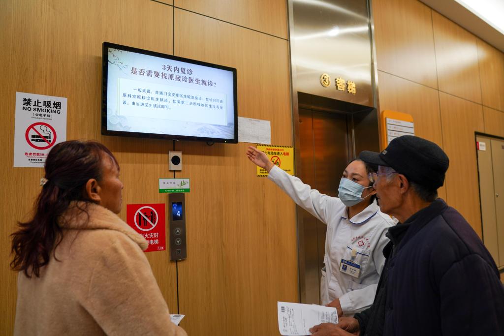 2024年11月22日,在成都医学院第一附属医院成华医院·成华区中医医院,导诊人员向患者解释“一次挂号管三天”惠民政策。新华社记者胥冰洁摄