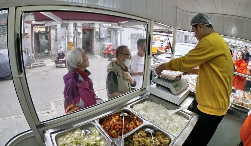 2024年10月31日,北京市东城区东四十三条胡同内的一辆养老助餐服务车在为老年人提供午餐。新华社记者李欣摄