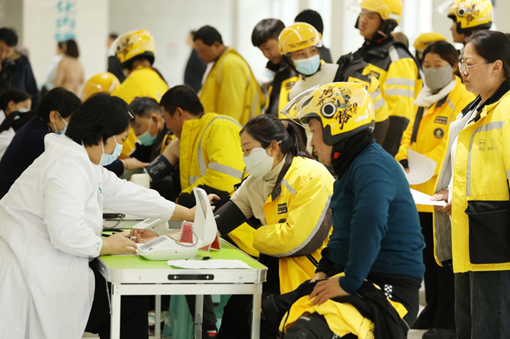 2024年10月22日,在山东省临沂市郯城县郯城街道卫生院,外卖骑手进行健康体检。新华社发(张春雷摄)