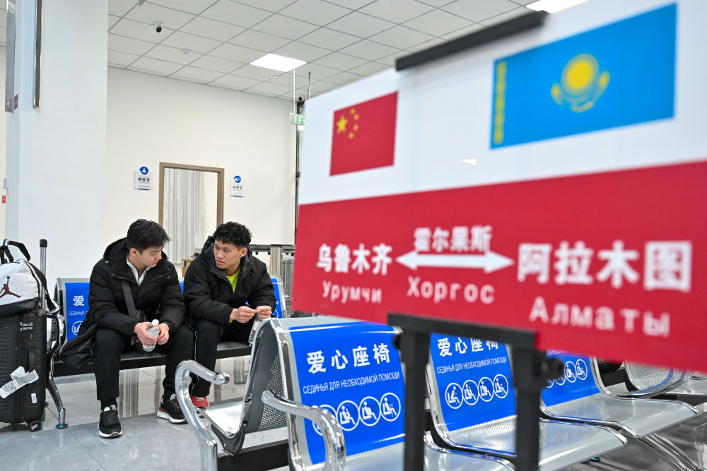 1月8日,在乌鲁木齐陆港国际客运站,伊利亚索夫·安瓦尔(左)和同学在候车厅等候前往阿拉木图的国际班车。新华社记者丁磊 摄