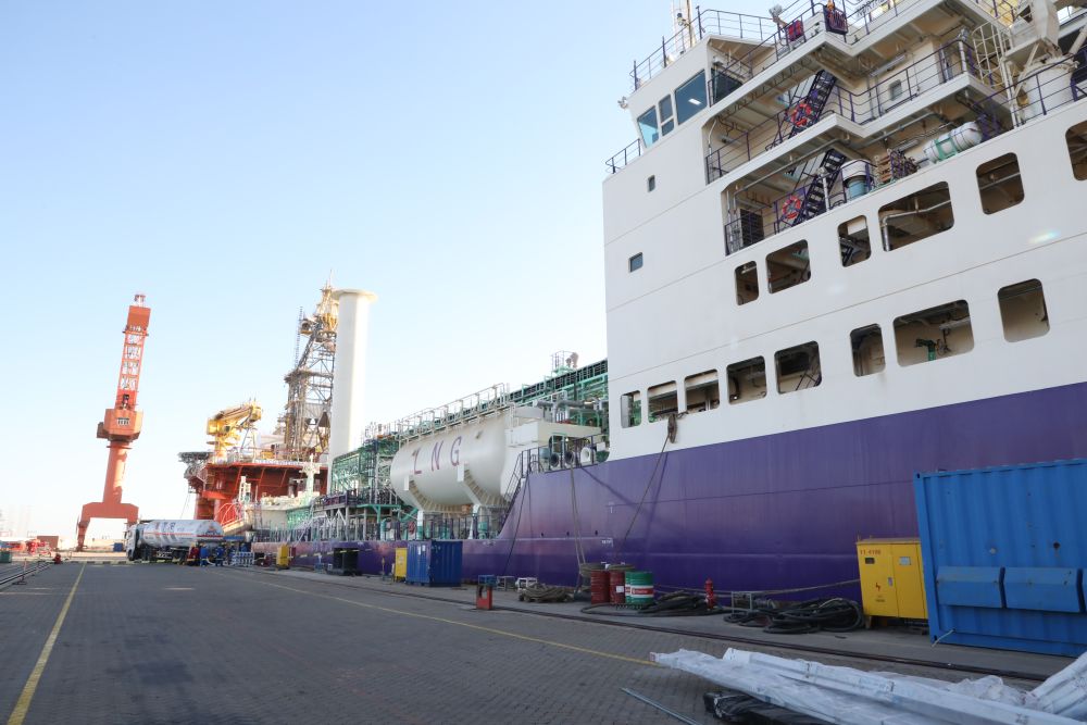 1月2日,在大连船舶海洋工程有限公司,一辆LNG运输卡车正在为“北极探路者”运输船进行保税LNG燃料加注。(辽宁自贸试验区大连片区管委会供图)