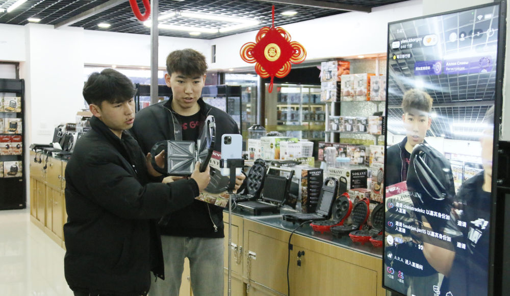 2月18日,在中哈霍尔果斯国际边境合作中心的义乌国际商贸城里,跨境电商主播向中亚消费者介绍中国商品。(马婷婷 摄)