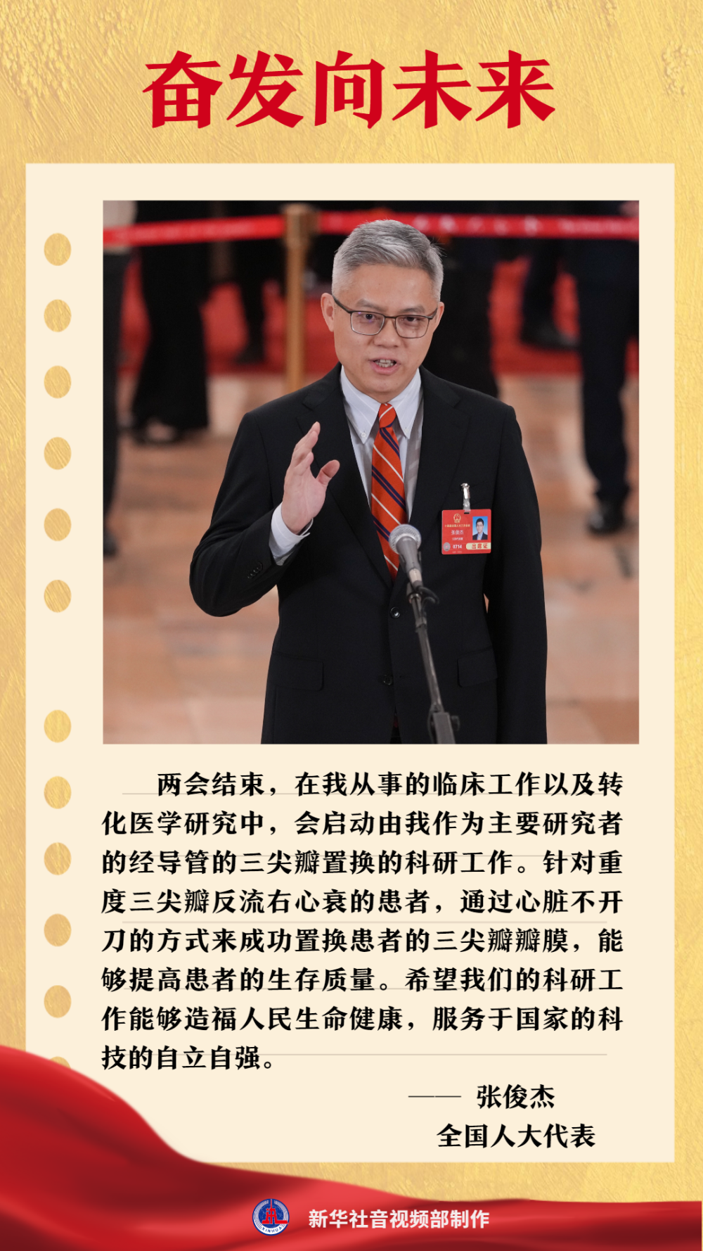 南京市第一医院副院长张俊杰代表,是一名心血管病医疗专家,同时也是一名转化医学领域的科技工作者。通过自主攻关,他研发出治疗肺高压器械,带领团队每年在全国开展300多台微创心脏瓣膜手术,用新技术为患者重建“心门”。