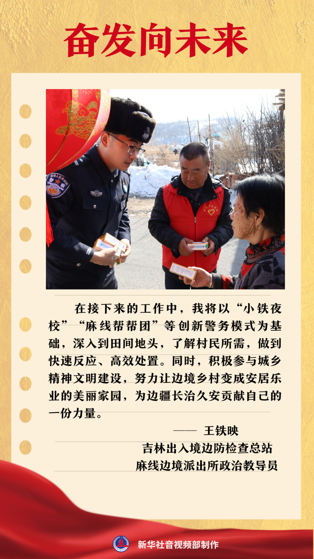 王铁映是一名基层移民管理警察。在工作中,他创新工作方式,协调合办“小铁夜校”,邀请农业专家、种植大户传授种植农技知识,促进乡村经济作物种植;推动建设村部红色影院、绿色休闲书吧等文娱场所,促进村民精神文化水平提升;建立“麻线帮帮团”公益组织,联合驻村工作队,向群众提供公益志愿服务……从警10余年的王铁映很关注全国两会。他告诉记者,学习了全国两会精神后,他的干劲更足了。