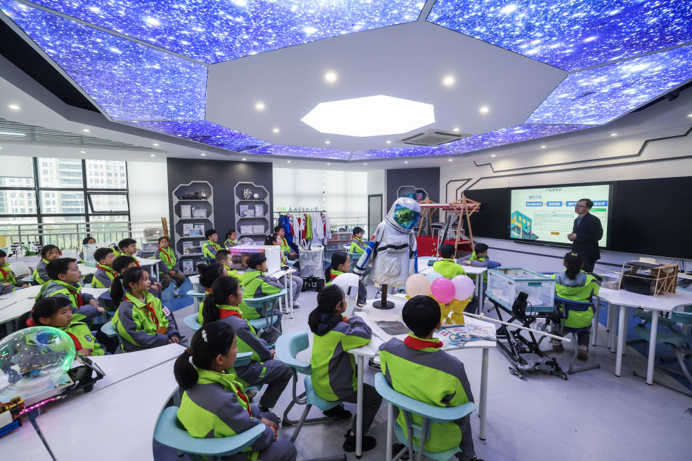 3月12日,在嘉兴市实验小学科技城校区内,老师在指导学生完成“AI赋能生活”项目化学习。新华社记者 徐昱 摄