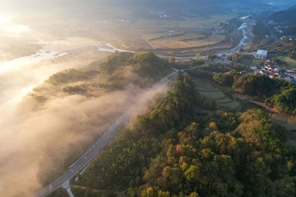 2024年11月8日,在安徽省宣城市旌德县三溪镇,“四好农村路”与错落有致的民居、青山、晨雾等相映成景(无人机照片)。新华社记者 曹力 摄