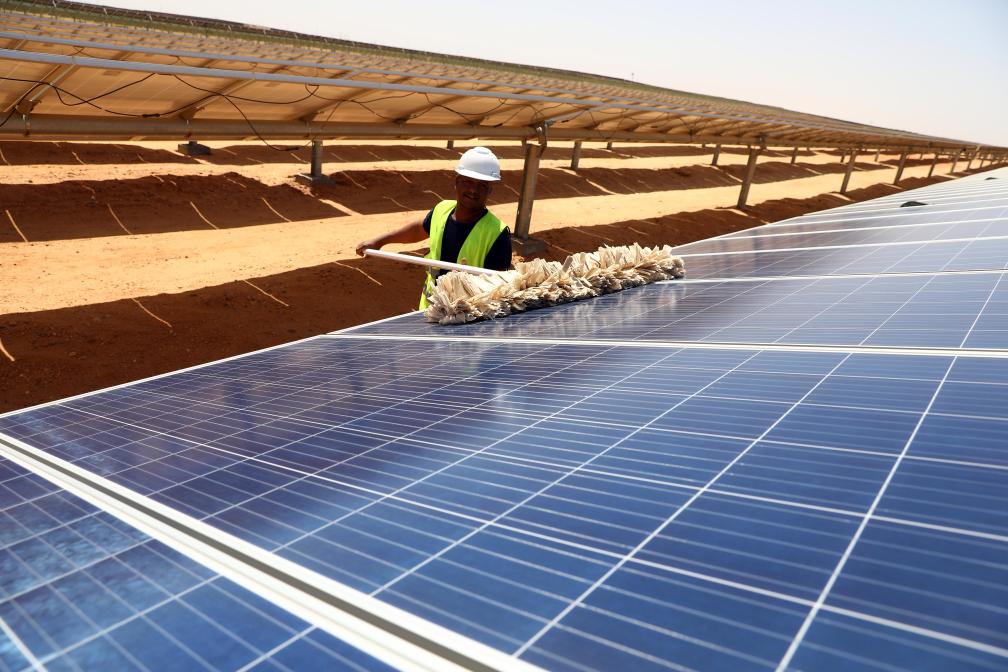 2024年4月21日,在埃及南部阿斯旺省的本班光伏产业园,工人对光伏组件进行尘土清除工作。新华社发(艾哈迈德·戈马摄)