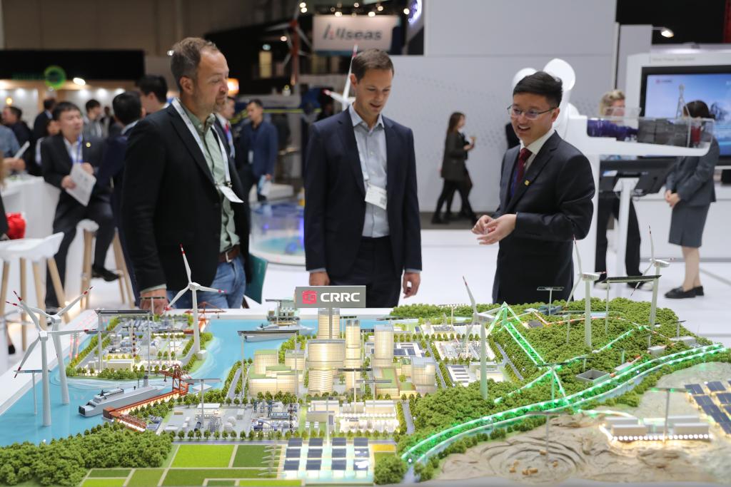 2024年9月24日,在德国汉堡国际风能展中国中车展区,工作人员为参观者讲解沙盘模型。新华社记者杜哲宇摄