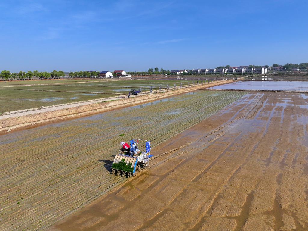 洞庭湖畔,湖南岳阳市屈原管理区惠众粮油专业合作社的田埂上,一盘盘秧苗码放整齐,插秧机穿梭田间。合作社负责人阳岳球正忙着指挥老乡们插秧:5人一组,3人上机操作、2人搬运秧苗,现场分工明确、有条不紊。