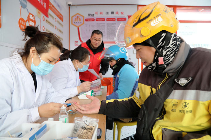 2025年3月5日,志愿者在山东省枣庄市市中区一工会驿站为外卖员免费测量血糖。新华社发(王海楠摄)