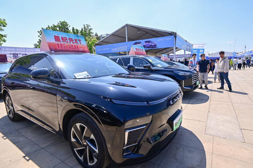 5月3日,消费者在山东省青州市举办的汽车·房产家居文化节上参观选购展出的汽车。新华社发(王继林摄)