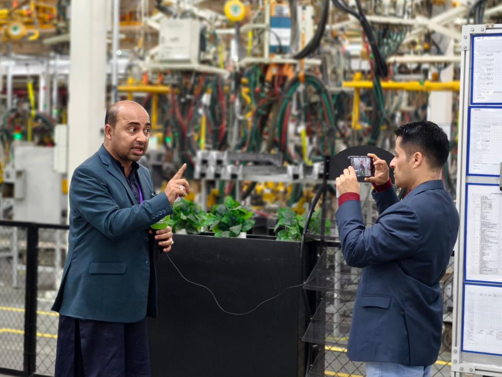 7月3日,巴基斯坦“萨驰新闻”新闻调查组负责人赛义德·奥恩·穆罕默德(左)在金杯(沈阳)汽车有限公司生产车间录制出镜视频。新华社记者温馨 摄
