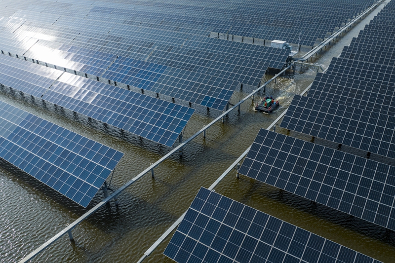 7月10日,在国家能源集团天津龙源新能源有限公司渤化光伏电站,工作人员乘船巡检光伏发电板(无人机照片)。