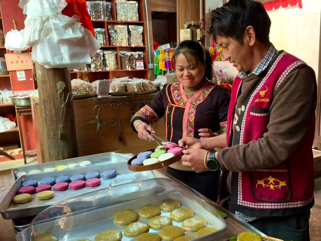 2026年1月27日,云南省腾冲市清水镇司莫拉佤族村村民李发顺夫妇正在为游客打包大米粑粑。新华社记者 熊轩昂 摄