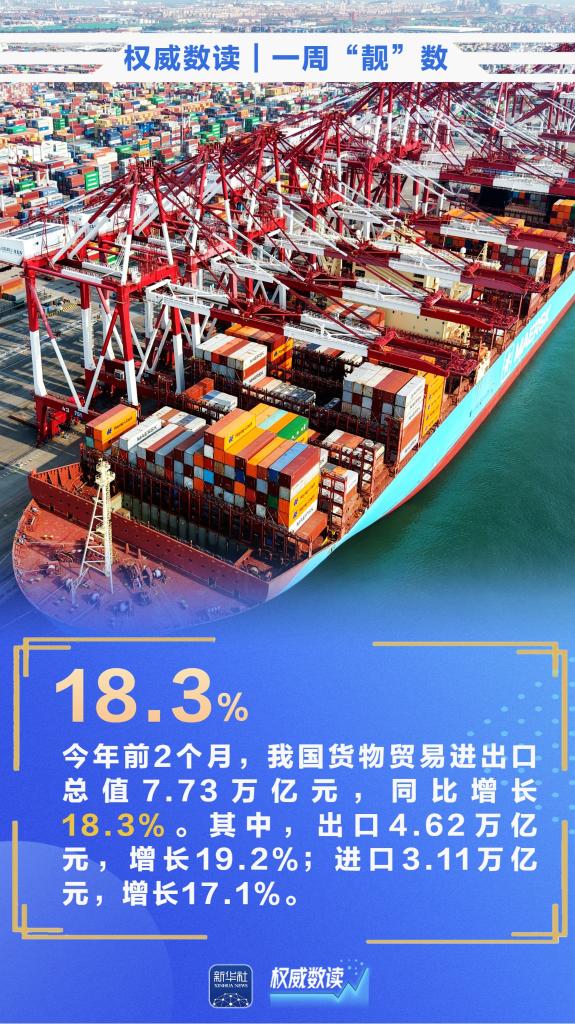 3月13日,为期40天的春运正式落下帷幕,预计春运40天全社会跨区域人员流动量为94亿人次;今年前2个月,我国货物贸易进出口总值7.73万亿元,同比增长18.3%;2月份,我国CPI同比上涨1.3%……本周,这些数据最值得关注!