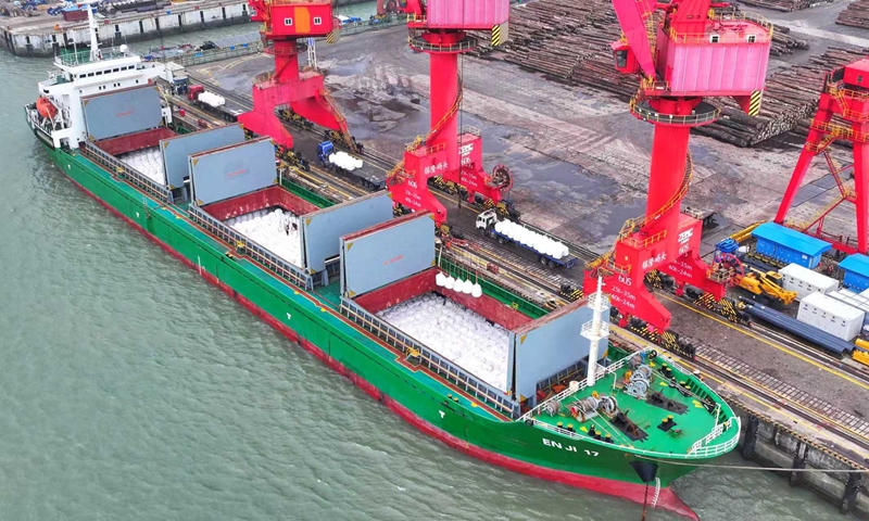 3月18日,在张家港锦隆重件码头,国际航行船舶在泊位上有序卸运进口化肥(无人机照片)。
