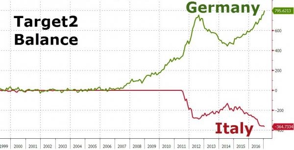 以上数字来自2016年12月份的统计结果。2017年1月31日,德国央行对自己的target2结算平衡情况进行了核查,发现其总量已接近7970亿欧元的新高。