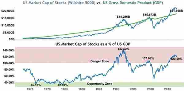 整体来看,除非投资者真的认为美国国债收益率会由于美国政府政策操纵而长期徘徊在当前的历史地位,否则美国股市的平均估值已经出现泡沫。根据“股神”巴菲特先生自己常用的股市估值指标来看,即美国股市总市值与美国GDP总量比值,目前美国股市总市值已经高达美国GDP总量的132%,从该指标的历史走势来看,目前美国股市已经明显出现估值过高的问题。