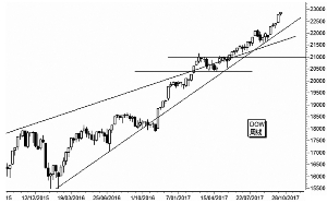 第三个特征是距现在更近的一条上升趋势线,它开始于2016年2月。它制造出一个看跌的上升楔形形态,这个形态经常是价格将崩溃并转向下方运行的信号。这种情况没有出现,这是一个看涨的结果,这个结果支持上升趋势将持续的看法。如果指数回落至这条位于22200点附近的趋势线,这将是进场的机会。