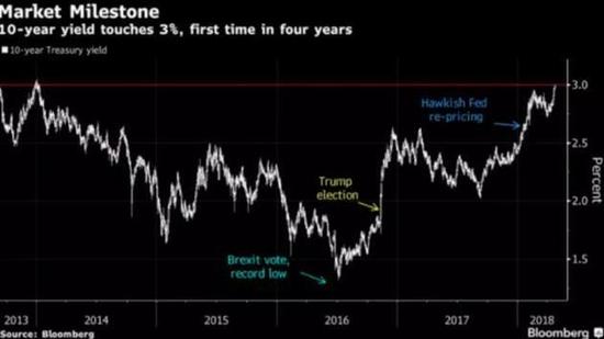 美债“破3”绝对不是一件平常事,自2011年以来,3%收益率的关卡只被短暂触及过两次,分别是在2013年和2014年初。