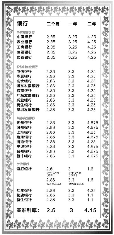 记者对杭城包括工、农、中、建、交5家大银行,中信、华夏、浦发等一些股份制商业银行以及浙商银行、杭州银行、宁波银行(002142)在内的部分城商行和部分外资银行的短中长期存款利率(分别为3个月、1年和3年)进行了调查分析,整理出一份利率表,需要存款的市民不妨作个参考。