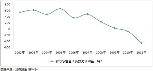 2008 年以前全球央行一直处于黄金净售出方,年售出量360-620 吨,占黄金供应的10-16%。2008 年金融危机后,官方售金大幅下滑,当年售出量仅占黄金供应量的6%;2009 年售金量只有33.6 吨,占当年总供应量不到1%; 2010 年央行正式从黄金净售出向净购入转变,当年黄金净购入73.6 吨,占黄金总需求量的2%。2011 年全球央行共购入黄金439.6 吨,占当年全球黄金供应量的9.8%。