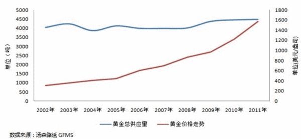 如下图所示,近十年黄金价格出现快速上涨趋势,2011年世界黄金的总供应量为4486吨,与2002年相比的年均增长率为1.16%,受美国和欧洲债务危机的影响,总增长率在2009年达到最高,为9.09%,而使黄金成为最好的投资选择之一的结果。总体看,全球黄金的供给呈现缓慢增长的态势,供给增长对未来金价并无太大压力。