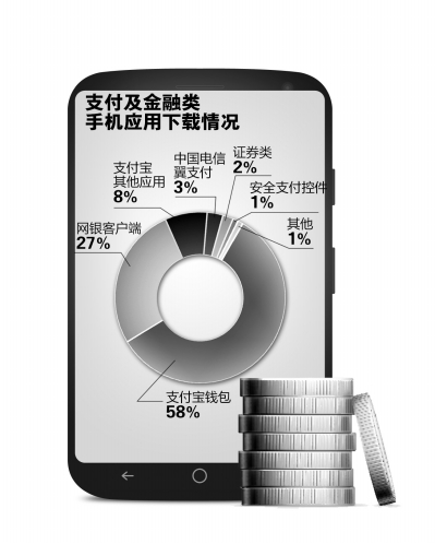 报告显示,在国内,与支付、网银、金融证券相关的各类移动应用的累计下载量已经超过4亿次。其中,支付宝钱包占比高达58%,是所有手机网银客户端软件下载总量的两倍多。