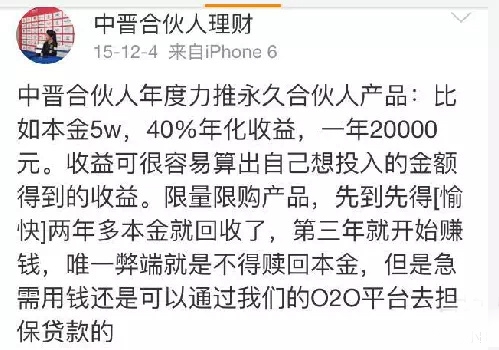 据悉,中晋资产曾经推出去的一款理财产品收益高达40%,更离谱的是不能赎回本金。一位网友的分析小融觉得很有道理:40%年化+销售提成20%+管理层提成20%+营销费用其他摊销20%=100%本金,同学,你的本金已经木有了。