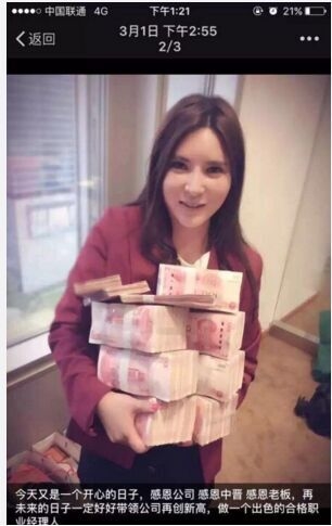 有过银行工作经历的同事告诉融360小编,此美女怀里抱着的钱应该有73万。前不久,这位美女顾问还在朋友圈里炫耀公司签约送金条、送豪礼,排队等候享受哈根达斯冰淇淋的待遇……