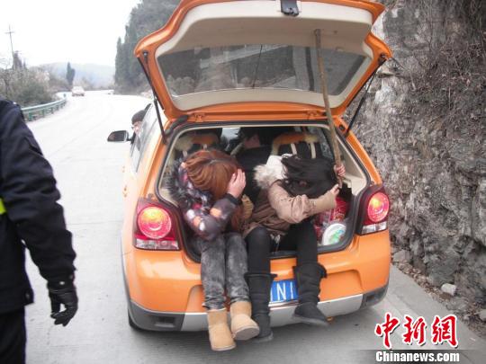 11日下午16时许,湖北宜昌市西陵交警大队南津关中队民警在三游洞峡口景区宜巴公路上执行春运检查时,一辆车号为“鄂E1N14*”的“大众”两箱轿车从民警身边驶过。就在这时,民警发现该车后厢盖完全打开,旁边用一根木棍撑着,里面居然并排坐着2个女孩,两人的腿都伸在车厢外面。民警立即驾车进行追赶,该车也似乎发现民警追赶,一路加油狂奔,民警追出约四公里才将该车截停。