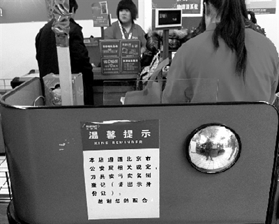 昨天下午,记者前往多家沃尔玛和家乐福门店进行探访,发现确有不少前来买菜刀的顾客因为没带身份证而无法购买。记者在一家家乐福门店看到,出售刀具的柜台均已上锁,旁边贴着“温馨提示”,提醒顾客如果需要购买刃长15厘米以上的刀具,必须出示身份证进行登记。在另一家家乐福门店的收银台旁,贴着这样一则提示:“本店遵循北京市公安局相关规定,刀具实行实名制登记(请出示身份证)”。
