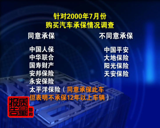 事实真的如此吗? 记者在江苏对2011年我国财产险公司中,业务收入排名前十位的保险公司进行了调查。结果,针对这辆2000年7月购买的小汽车,五家保险公司同意对承保车损险,其中包括中国人保,中华联合,国寿财产,安邦保险和永安保险。太平洋保险表示可对此车承保,但不承保车龄在12年以上的车辆。其余四家保险公司不同意承保,包括中国平安,大地保险,阳光保险和天安保险。