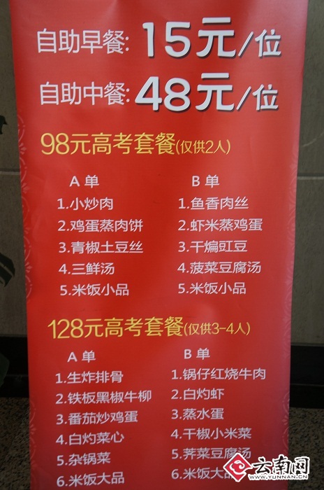 考生的餐饮也成了商家关注的焦点。记者发现,在云师大实验中学考点附近的文化巷,很多小店都贴出了“祝考生金榜题名”等宣传字样来吸引顾客。
