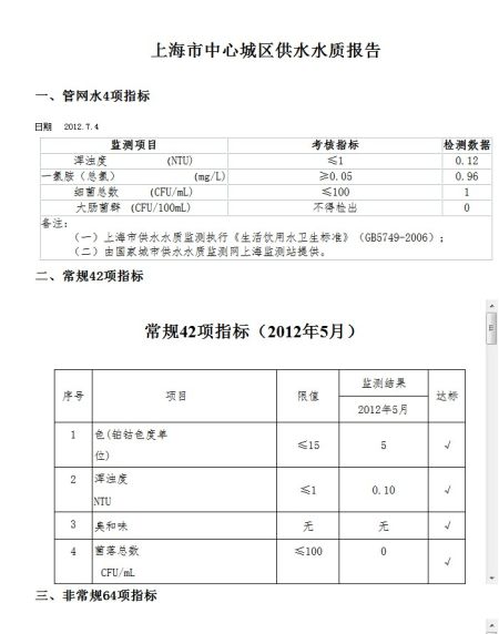 “按照新国标规定的检测频率,今后我们会每月公布常规42项指标、每半年一次公布非常规64项指标。”市供水部门相关负责人告诉记者,今天发布的《上海市中心城区供水水质报告》,是本市供水水质按照国家新标准检测后的首次发布,“今后,会每月定期向市民公布。”