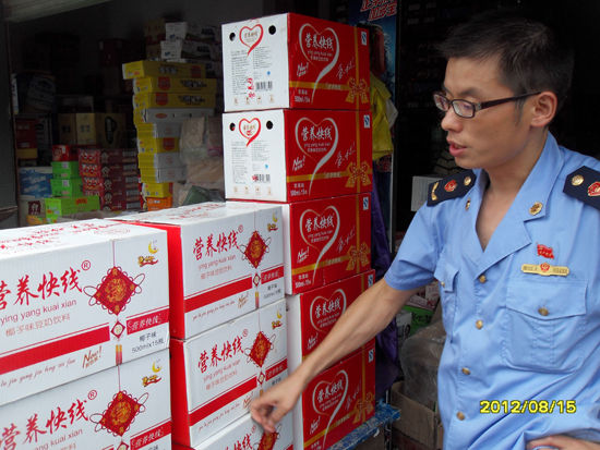 8月15日,杭州市工商局拱墅区工商分局和睦工商所的执法人员在拱墅区三墩都市水乡食品商业街一家名为“恒发食品商行”的店铺中查出10箱商标标注为“营养快线”的饮料。这些饮料的生产厂家和商标持有人都不是娃哈哈公司。 (新华网 潘晓亮摄)